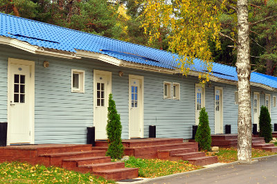 В одноэтажном здании пять однокомнатных двухместных номеров и два однокомнатных трехместных номера. В каждый номер отдельный вход.